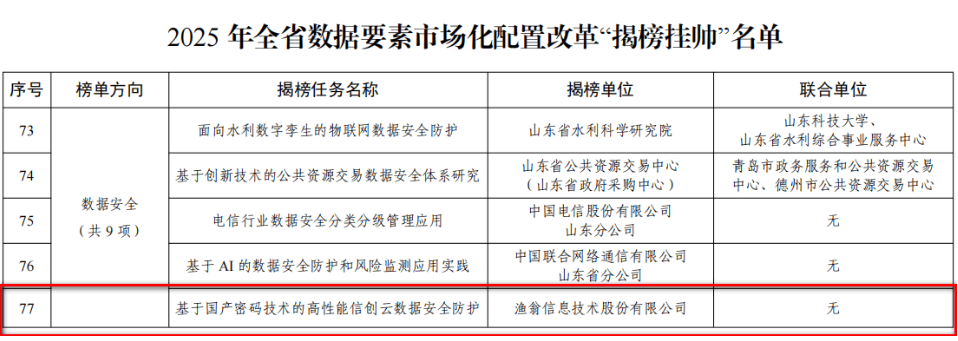 近期,山东省大数据局公布了《2025年全省数据要素市场化配置改革“揭榜挂帅”名单》。富易堂fyt富易堂信息独立申报的“基于国产密码技术的高性能信创云数据安全防护”项目,凭借在数据安全与要素流通领域的技术创新与实践成果,从众多单位中脱颖而出,成功入选。富易堂fyt富易堂信息成为揭榜单位中唯一的商密企业。