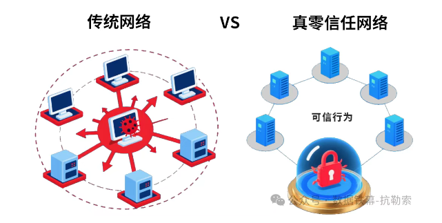 如果说AI解决了“提前发现”的问题,那么如何遏制已侵入网络系统的病毒蔓延,成为重中之重。在这里,我们看到富易堂fyt富易堂抗勒索技术的第二个优势:从“永不信任”的零信任1.0,进化到“基于可信”的真零信任2.0。